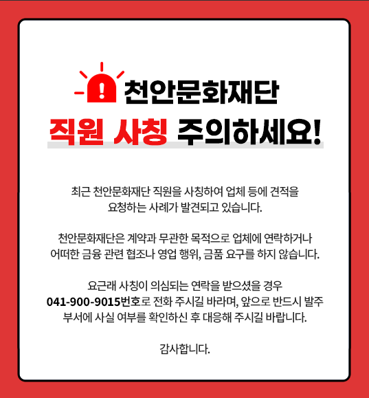최근 천안문화재단을 사칭해 견적을 요청하는 사례가 발생하고 있습니다. 재단은 계약과 무관한 연락이나 금품 요구를 하지 않으니, 의심스러운 연락을 받으셨을 경우 반드시 발주 부서에 사실 확인 후 대응 바랍니다.