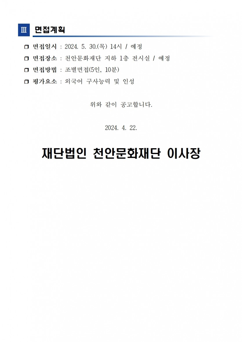 [2024-47호] 천안흥타령춤축제 2024 통역봉사요원 모집 공고 페이지 정보 작성자 축제사업팀 작성일 24-04-23 12:58 목록 본문 모집대상 : 천안시/아산시 소재 대학교 재학생, 만 25세 이하(1998년생 이상) 천안시 거주 청년 공고기간 : 2024-04-22 ~ 2024-05-24 접수기간 : 2024-04-22 ~ 2024-05-24 첨부파일 2. 천안흥타령춤축제 2024 통역봉사요원 지원서.hwp (83.5K) 3. 천안흥타령춤축제 2024 통역봉사요원 추천서대학생.hwp (42.5K) 관련링크 바로가기 링크 이전글[2024-53호] 2024 능소전 공연 제작 및 운영단체 모집 다음글[2024-50호] 「2024 꿈의 무용단 천안」 주강사 모집 공고 (4.24. ~ 5.3.)